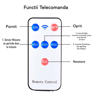 - Control: Telecomandă cu multiple funcții (ON/OFF, 3 moduri de iluminare)